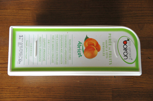 アプリコットピューレ。冷凍庫から出して室温で10分くらい放置。その後スプーンで適量取ります。 使用後又冷凍庫に入れて置けば結構日持ちするようです。有名百貨店等で入手可能です。